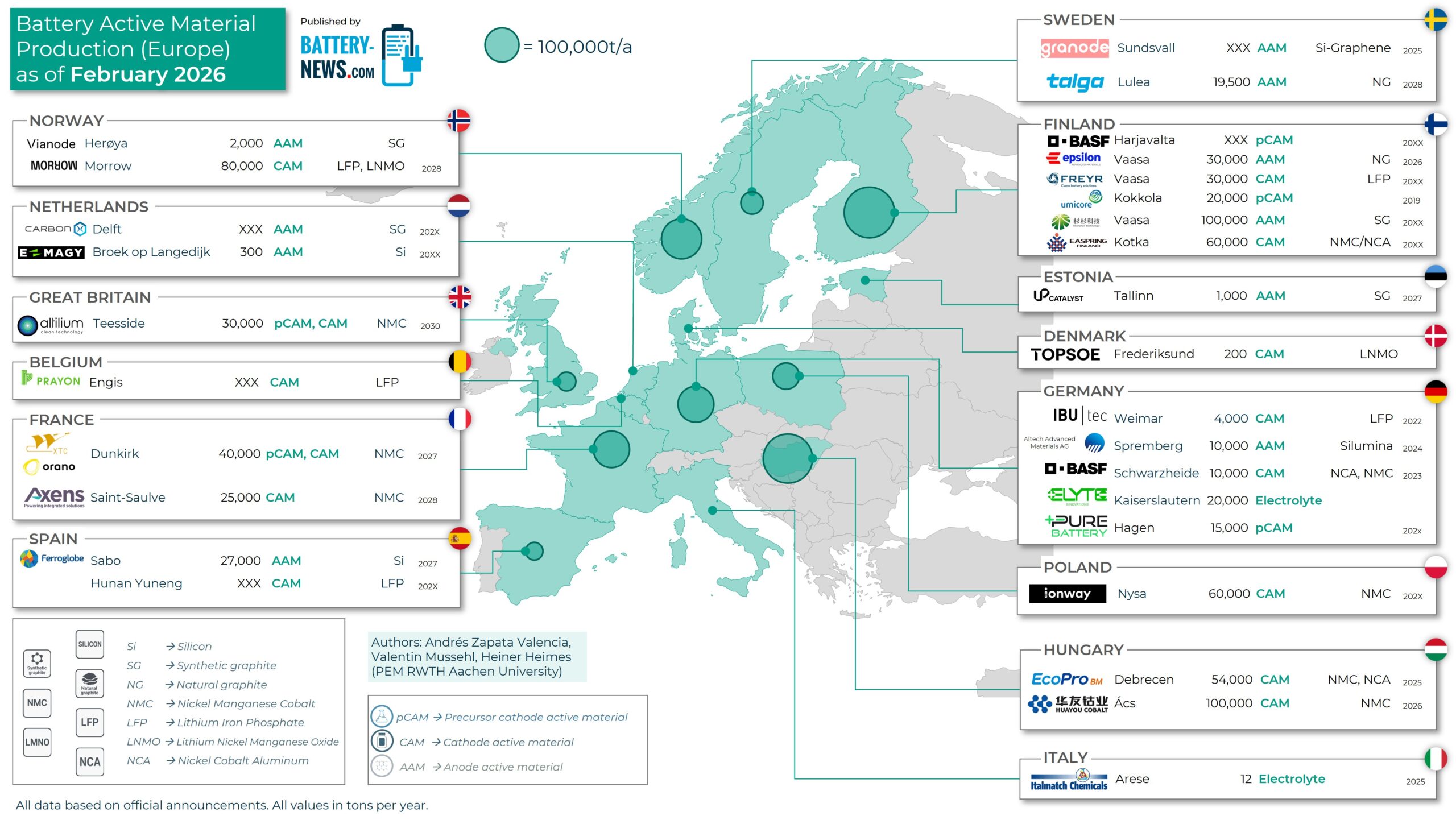 Die Battery-News präsentieren eine Übersicht zu geplanten und bereits umgesetzten Projekten im Bereich der Aktivmaterialien von Lithium-Ionen-Batterien in Europa. Die zugrunde liegenden Daten stammen aus offiziellen Mitteilungen der jeweiligen Akteure und verlässlichen Quellen aus dem Umfeld der Batterieproduktion.