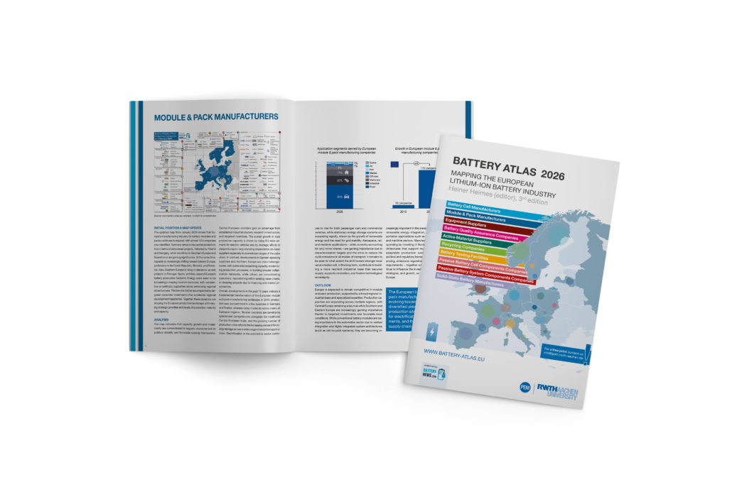 The Battery Atlas 2026 covers ten market segments, including battery cell manufacturers, module and pack producers, machine and plant manufacturers, quality assurance companies, active material suppliers, recycling companies, as well as passive cell and battery system component providers. For the first time, it also maps developments in future battery generations, including solid-state, lithium-sulfur, and sodium-ion technologies.