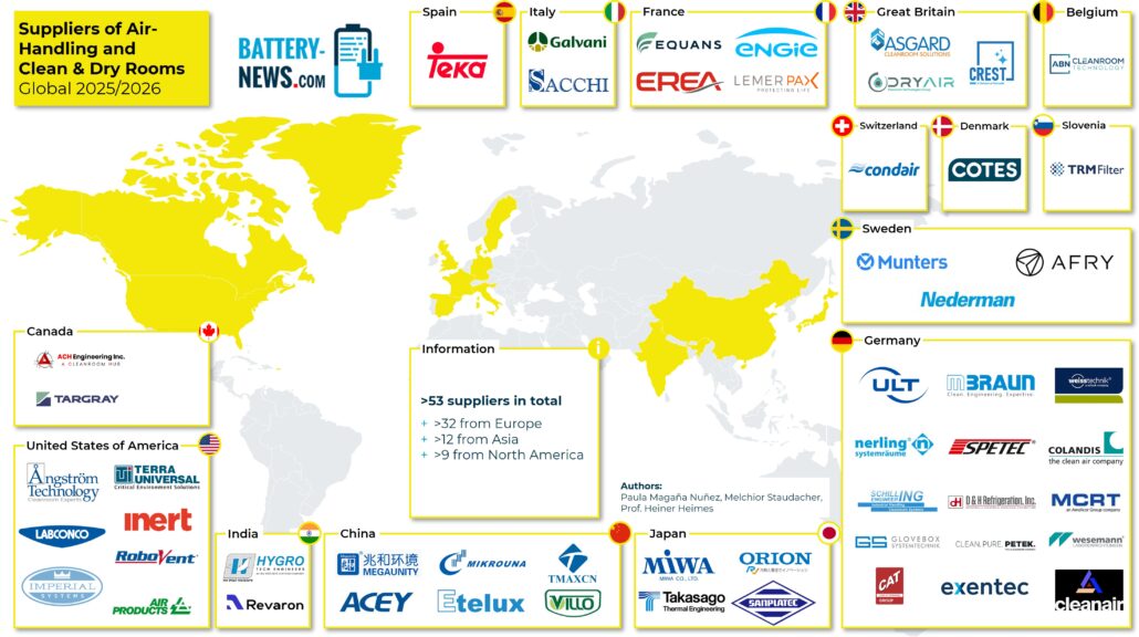 Die Battery-News präsentieren eine globale Übersicht zu Anbietern von Lüftungsanlagen und Reinräumen. Die zugrunde liegenden Daten stammen aus offiziellen Mitteilungen der jeweiligen Akteure und verlässlichen Quellen aus dem Umfeld der Batterieproduktion.